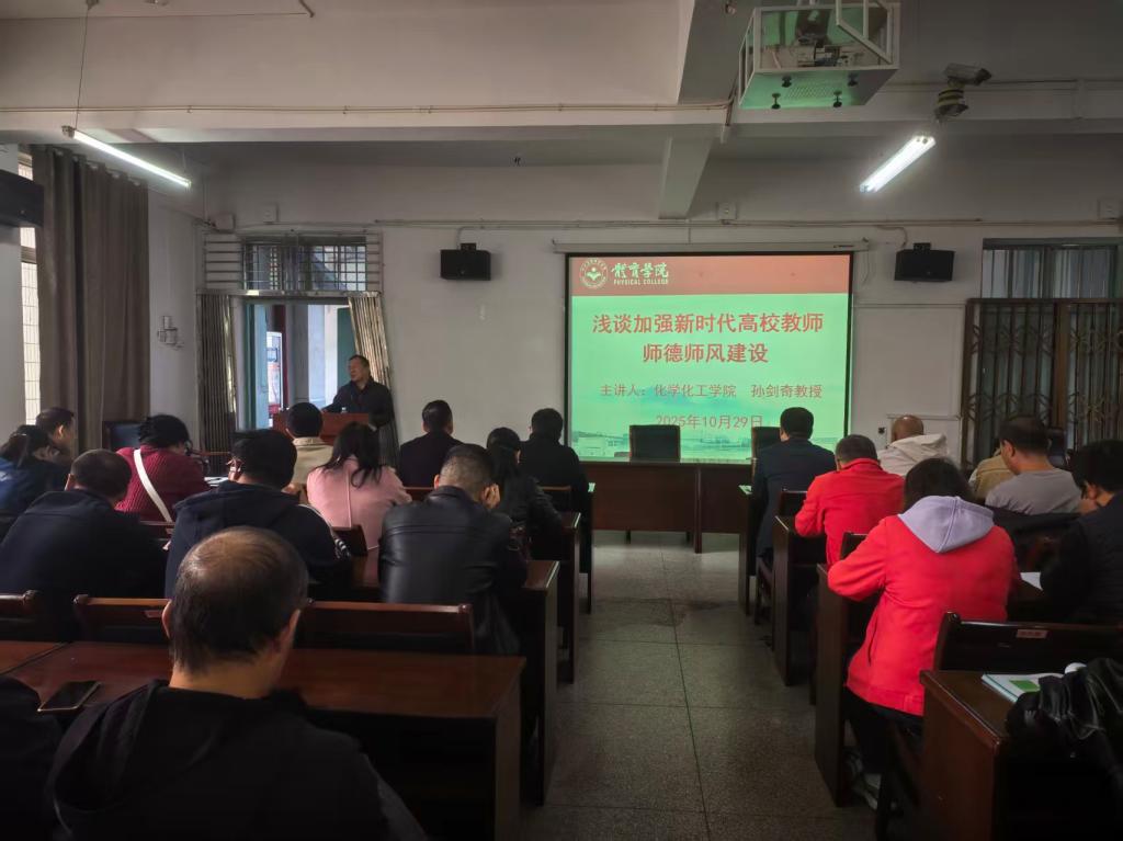 为深化新时代高校教师师德师风建设,强化育人使命担当,10月29日下午,体育学院在向学楼301会议室举行2025年度师德师风宣讲报告会,特邀九江学院师德师风宣讲团成员、化学化工学院孙剑奇教授作宣讲报告。学院领导、全体教职工和学生代表参加报告会,报告会由院党委书记付和忠主持。