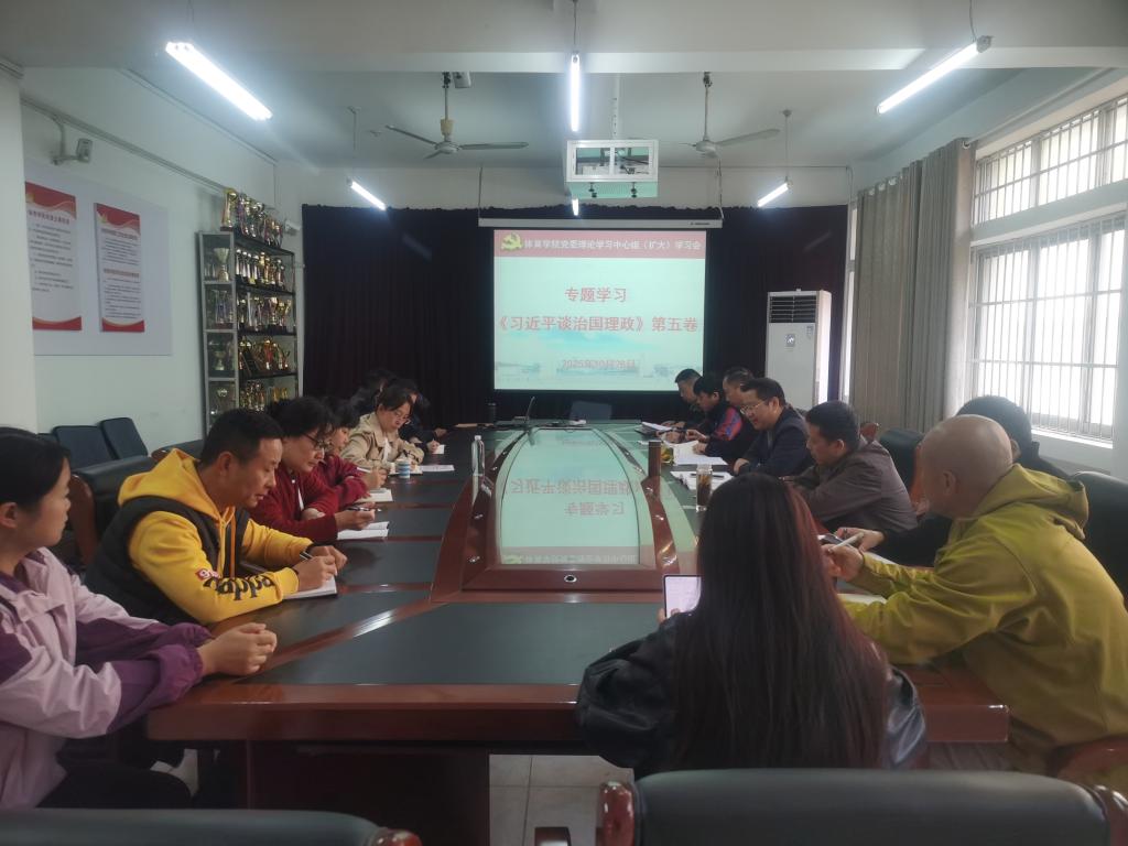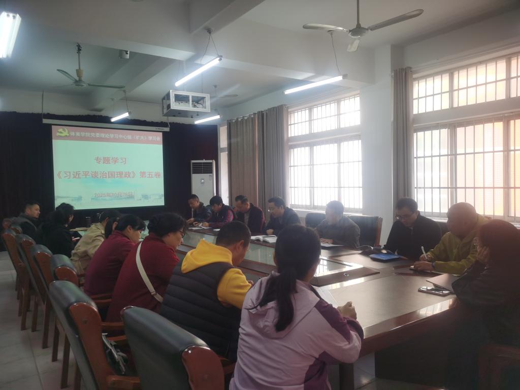 10月28日上午,体育学院在向学楼311会议室召开10月份党委理论学习中心组(扩大)学习会,专题学习《习近平谈治国理政》第五卷,学院领导班子成员、科室负责人、党支部书记参加了会议,教育学院党委副书记高原听会指导,会议由院党委书记付和忠主持。