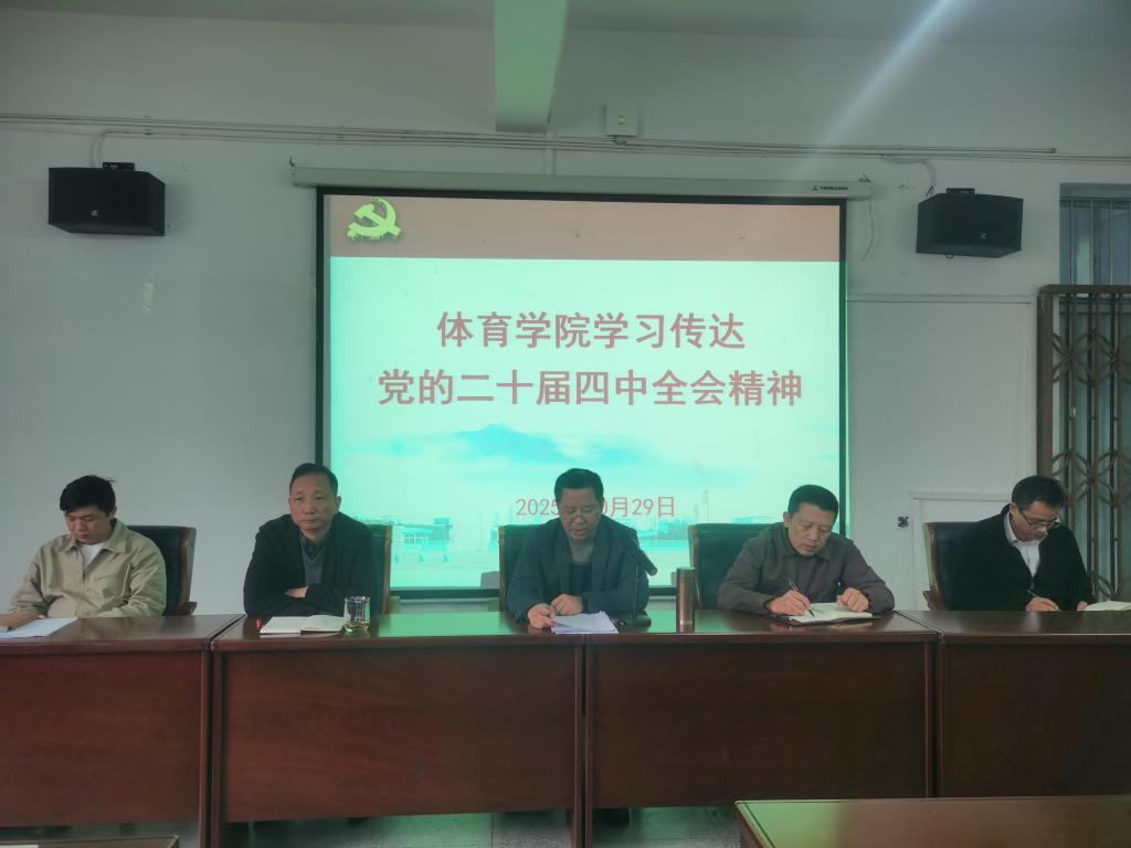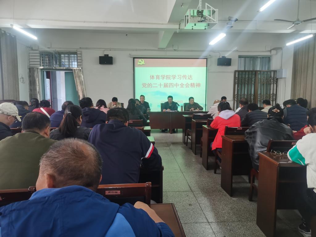 10月29日下午,体育学院在向学楼301会议室召开全体教职工大会,学习传达党的二十届四中全会精神。学院领导、科室负责人、全体教职工参加会议,会议由院党委书记付和忠主持。