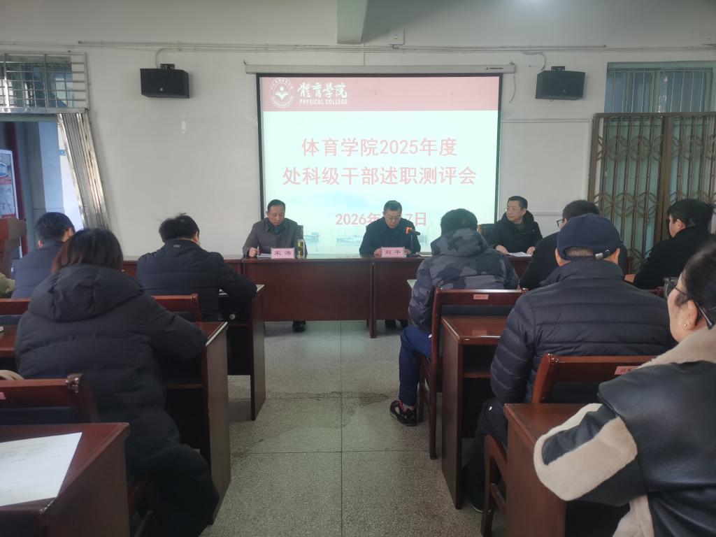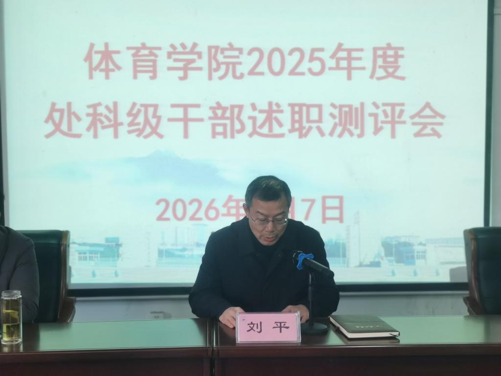 2026年1月7日下午,体育学院在向学楼301会议室召开2025年度领导班子及处科级干部述职测评会,校党委委员、宣传部部长刘平到会指导,宣传部思想政治教育科科长仲维春、人事处人事管理科科长张超陪同,体育学院党政领导、全体教职工参加了会议,会议由付和忠主持。