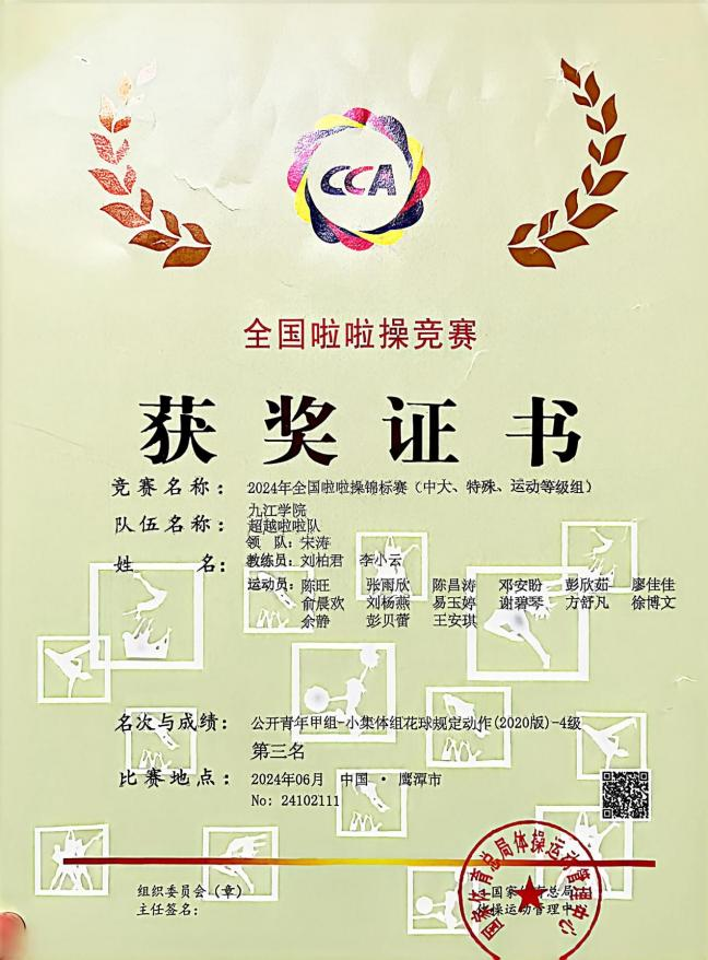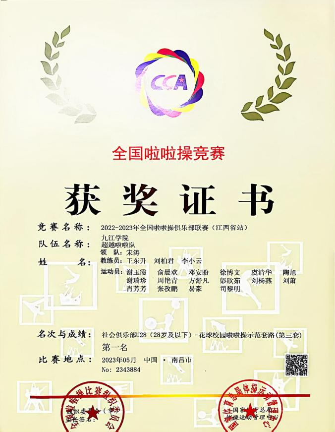 运动竞赛方面,获得2022-2023年全国啦啦操俱乐部联赛花球校园啦啦操示范套路(第三套)第一名、2024年全国啦啦操锦标赛公开青年甲组小集体组花球规定(2020版)4级第三名、2024年全国啦啦操社区运动会公开青年组小集体组花球规定动作(2020版)4级全国优胜奖及江西省第一名等10余项奖项,同时取得啦啦操二级裁判员、二级教练员等职业资格证书。