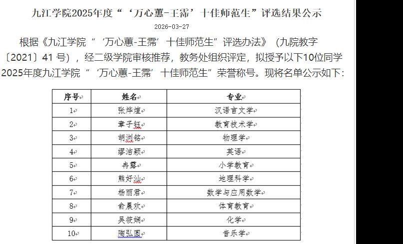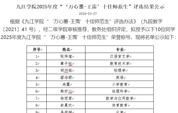 根据《九江学院“‘万心蕙-王霈’十佳师范生”评选办法》,经二级学院审核推荐,教务处组织评定,授予10位同学2025年度九江学院“‘万心蕙-王霈’十佳师范生”荣誉称号,我院体育教育专业A2213班俞晨欢同学荣获九江学院2025年度“‘万心蕙-王霈’十佳师范生”称号。