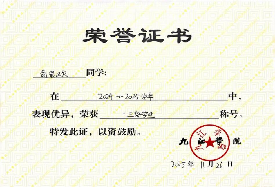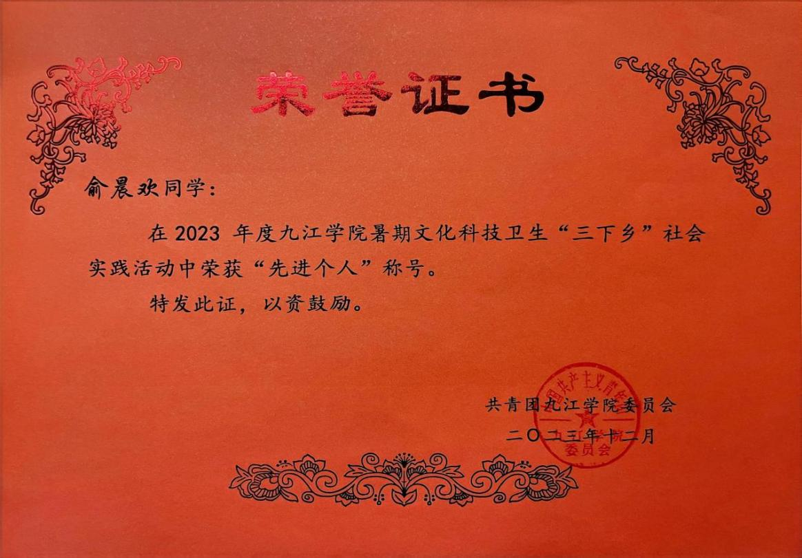 在学期间,俞晨欢以中共党员标准践行责任担当,担任班级副班长、学院学生会副主席期间,以高度的责任心和服务意识参与迎新工作、青马工程、校运会等实践活动。荣获2023年度九江学院暑期文化科技卫生“三下乡”社会实践活动“先进个人”称号,连续6次获得校级奖学金。